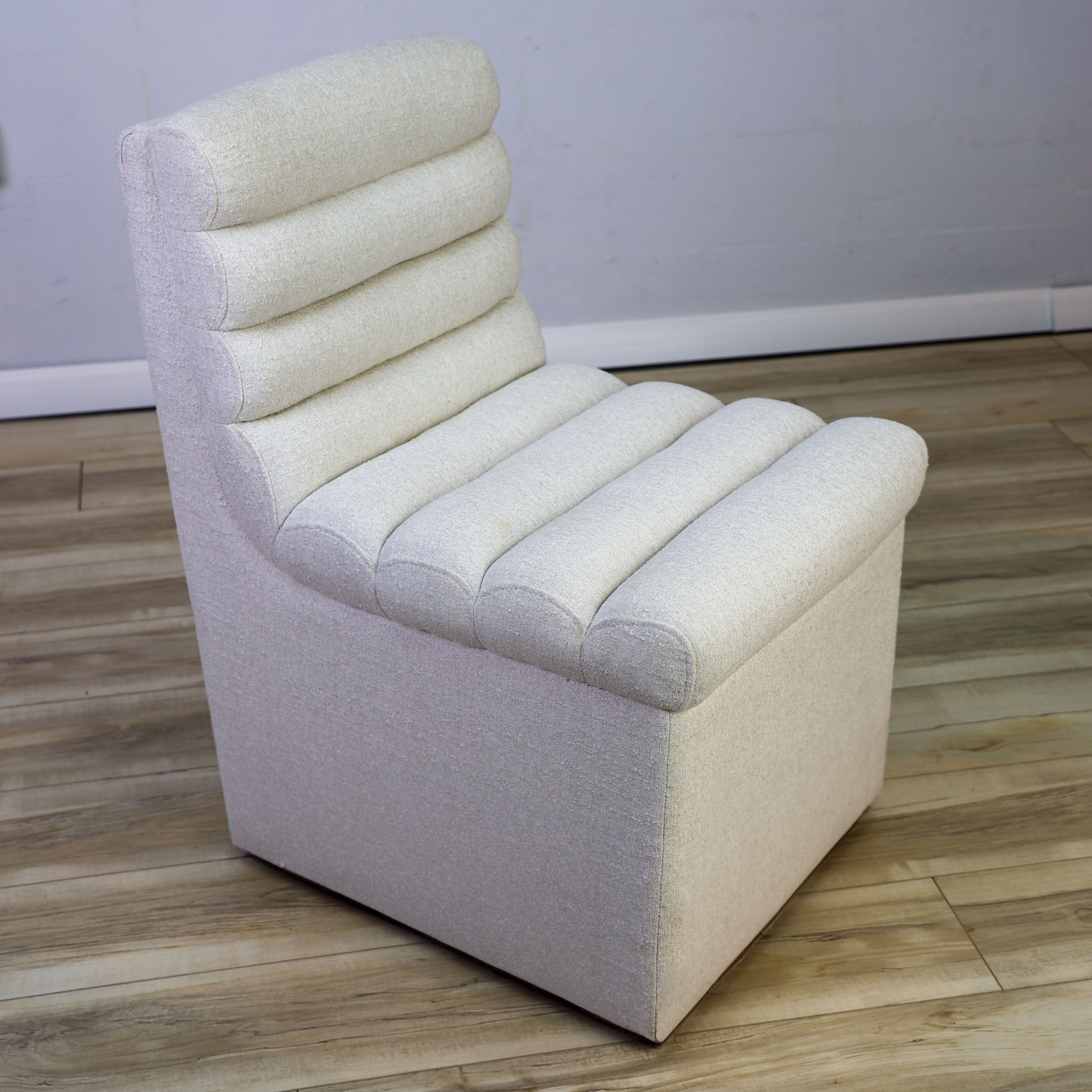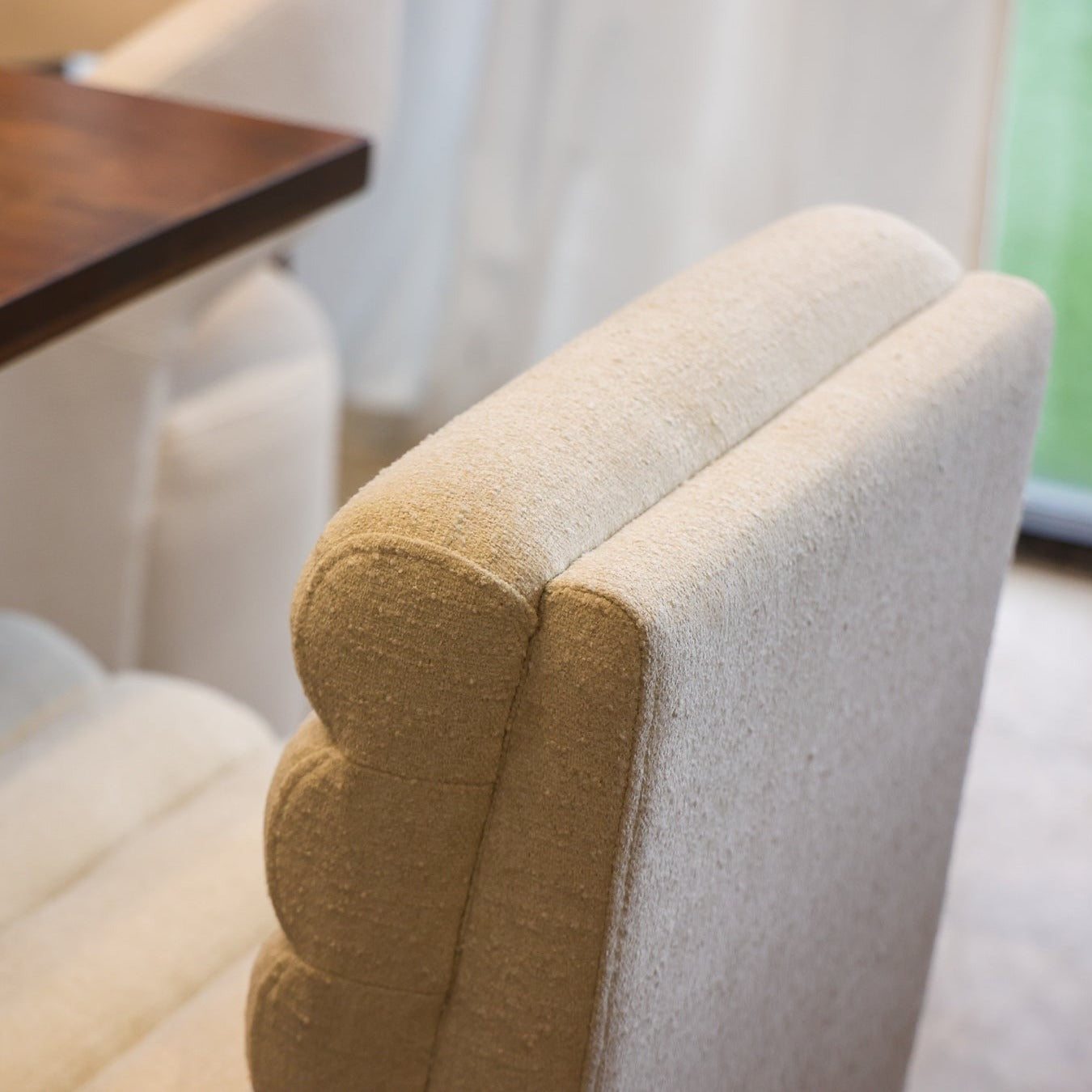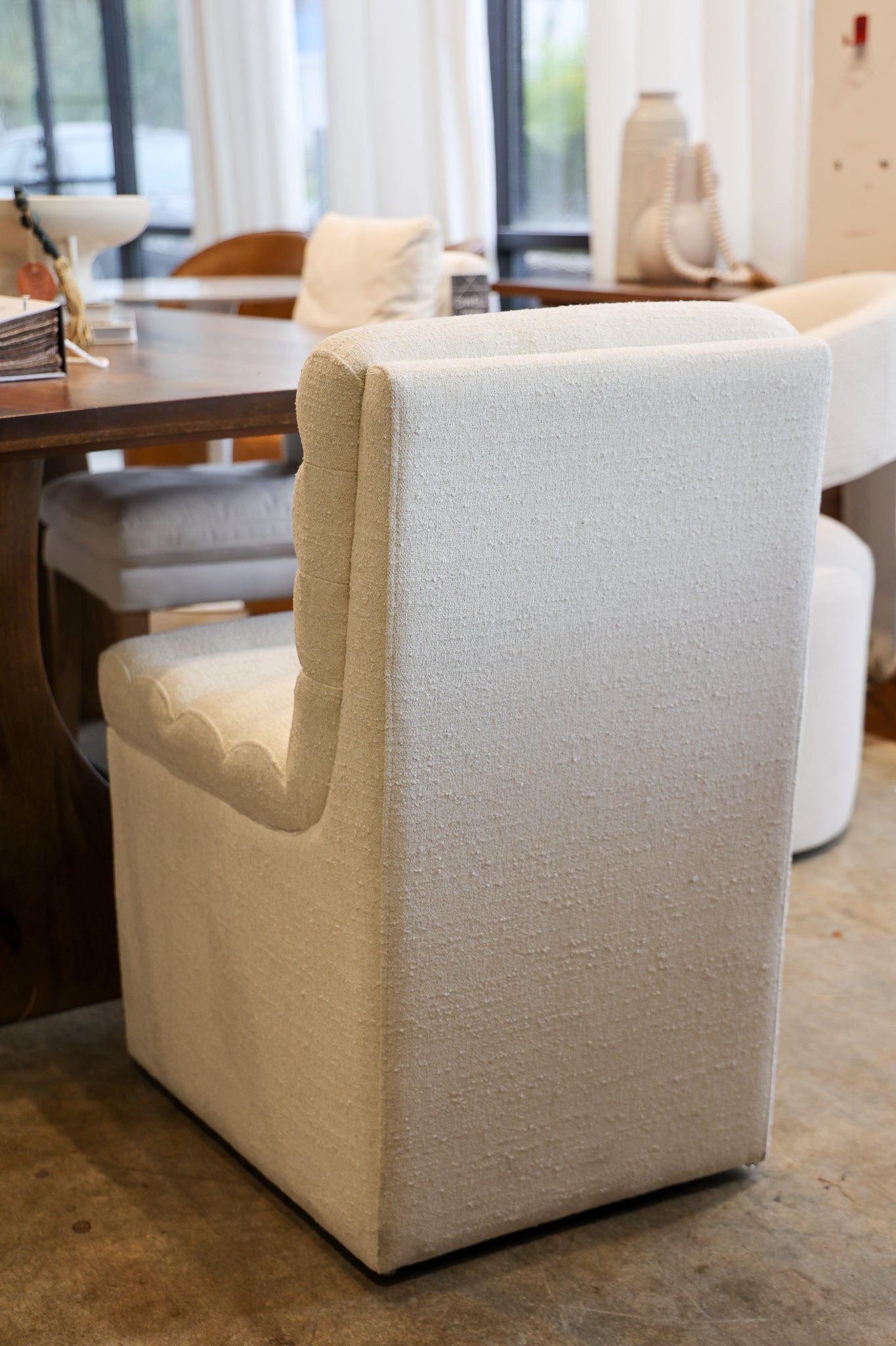 The Suresh Rolling Dining Chair features a luxe boucle fabric and a channeled style for a luxurious touch. This chair is perfect for dining rooms with a modern aesthetic, providing both comfort and style. Roll it to wherever needed with ease.