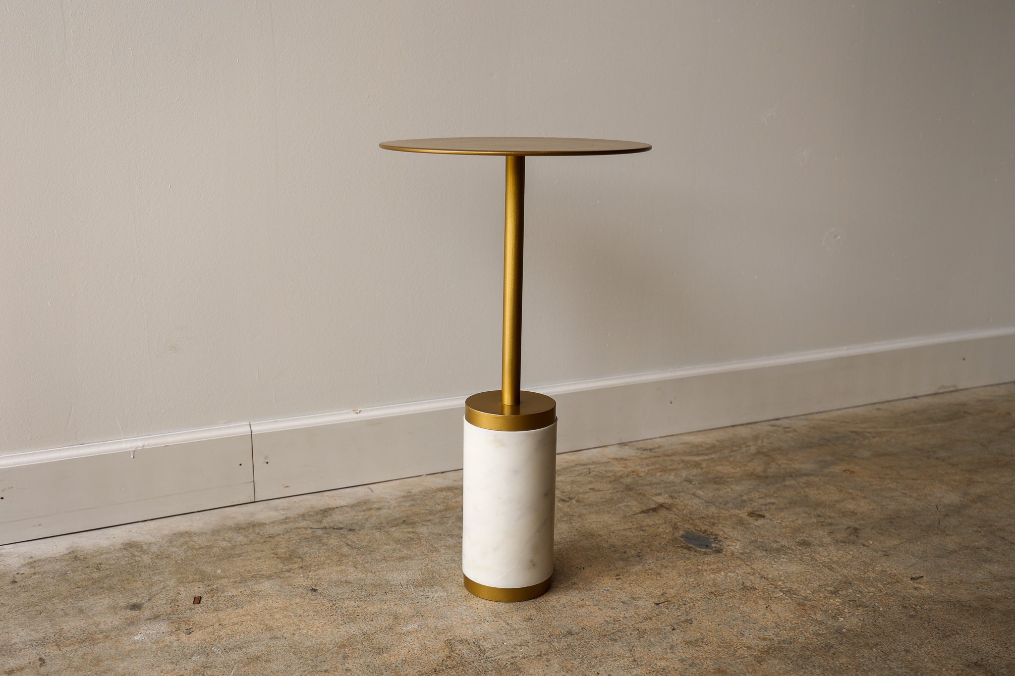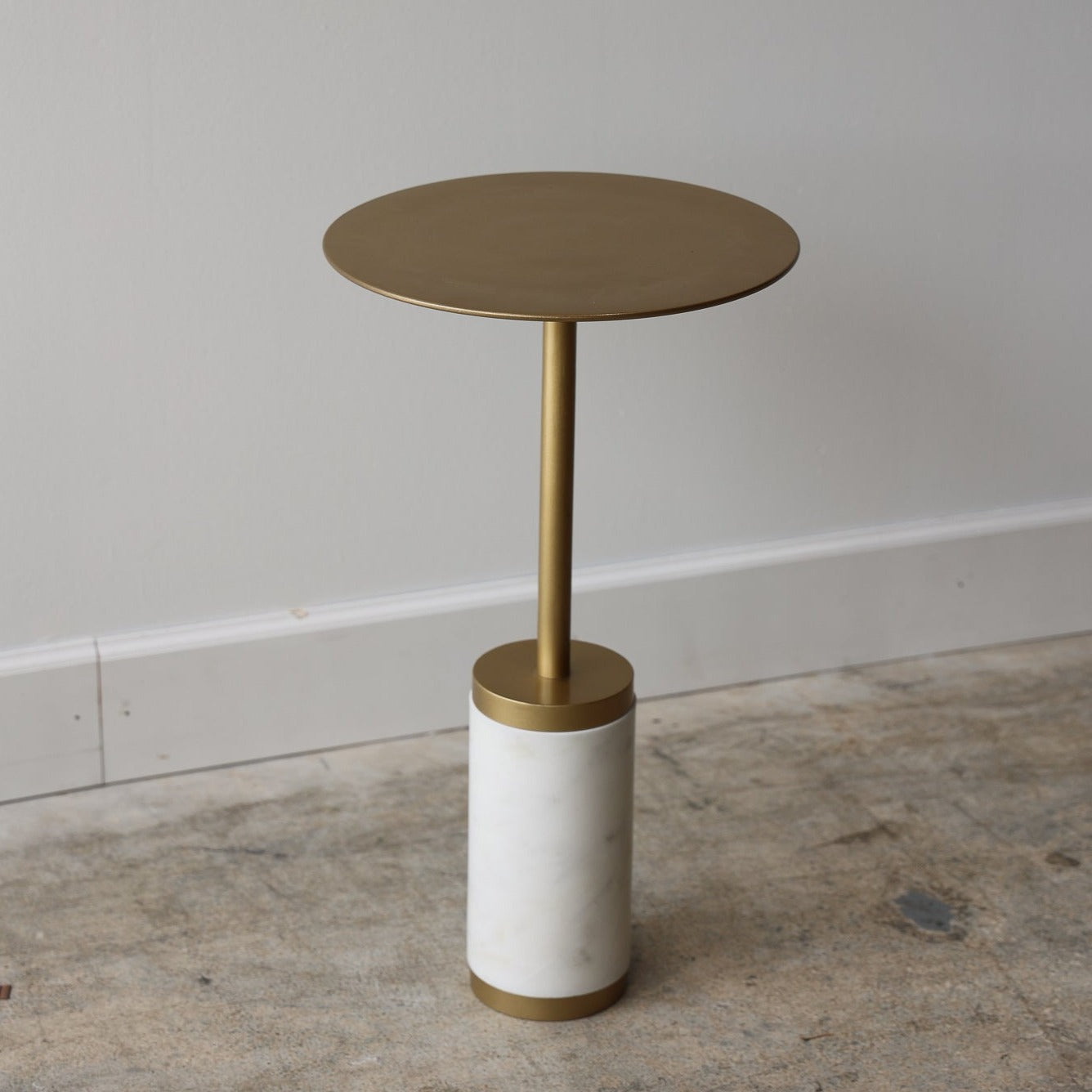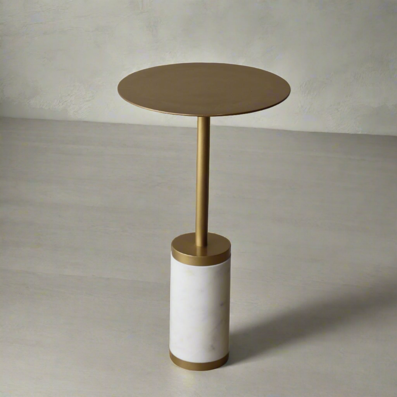 This sleek drink table is the perfect way to add style and function to your space. It features a polished marble base and a shining brass top, combining classic elements for a timeless style. Its classic design makes it the perfect accent piece for any living room.