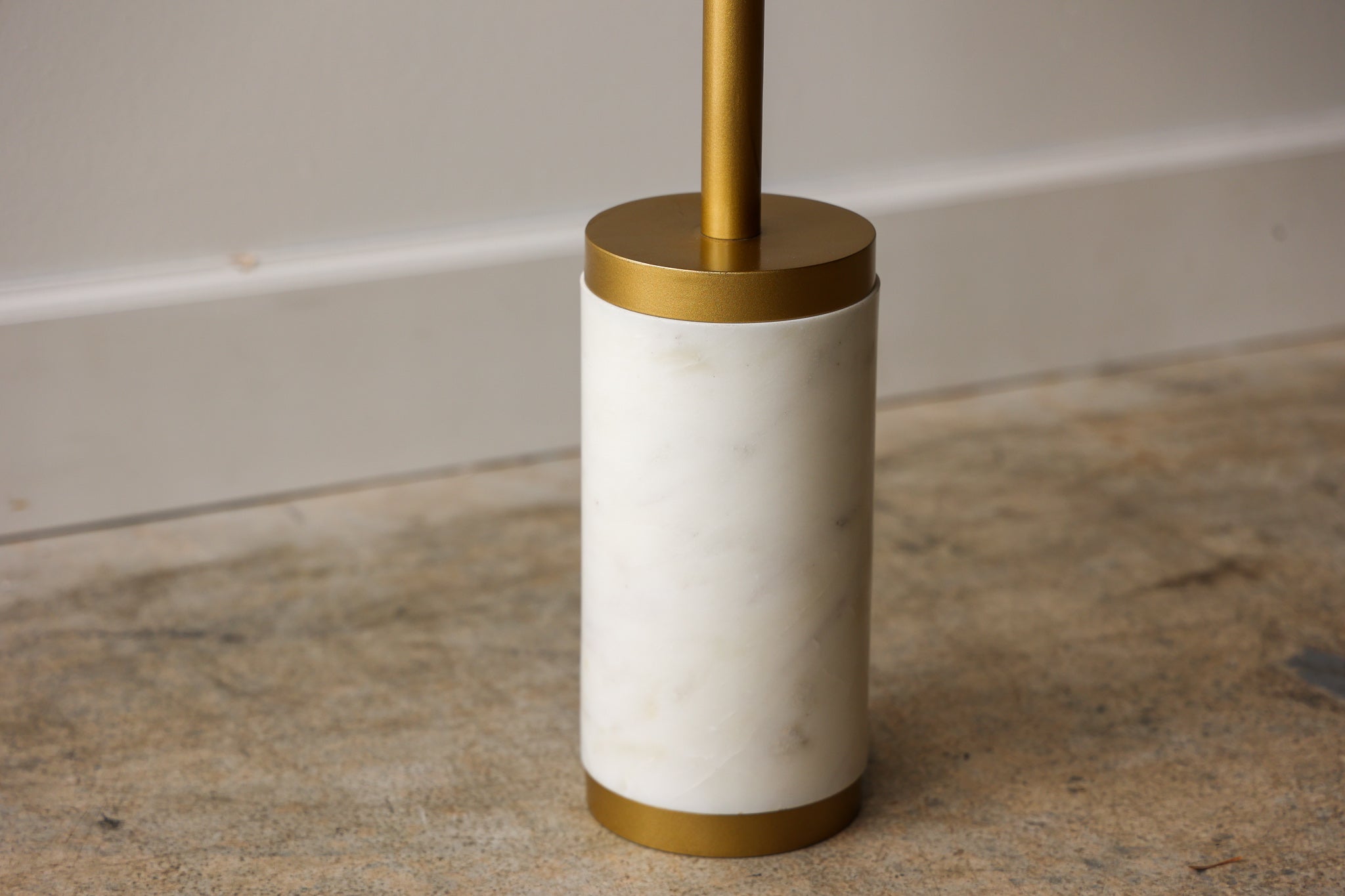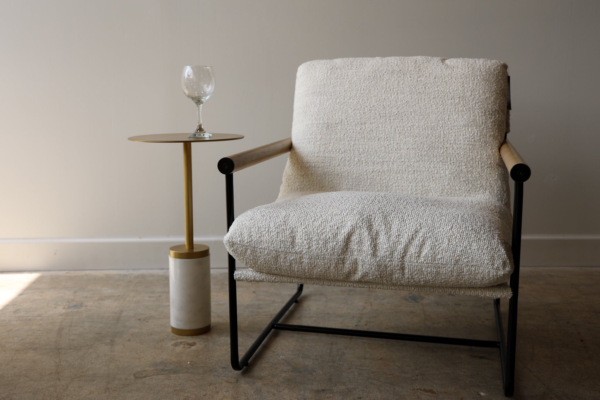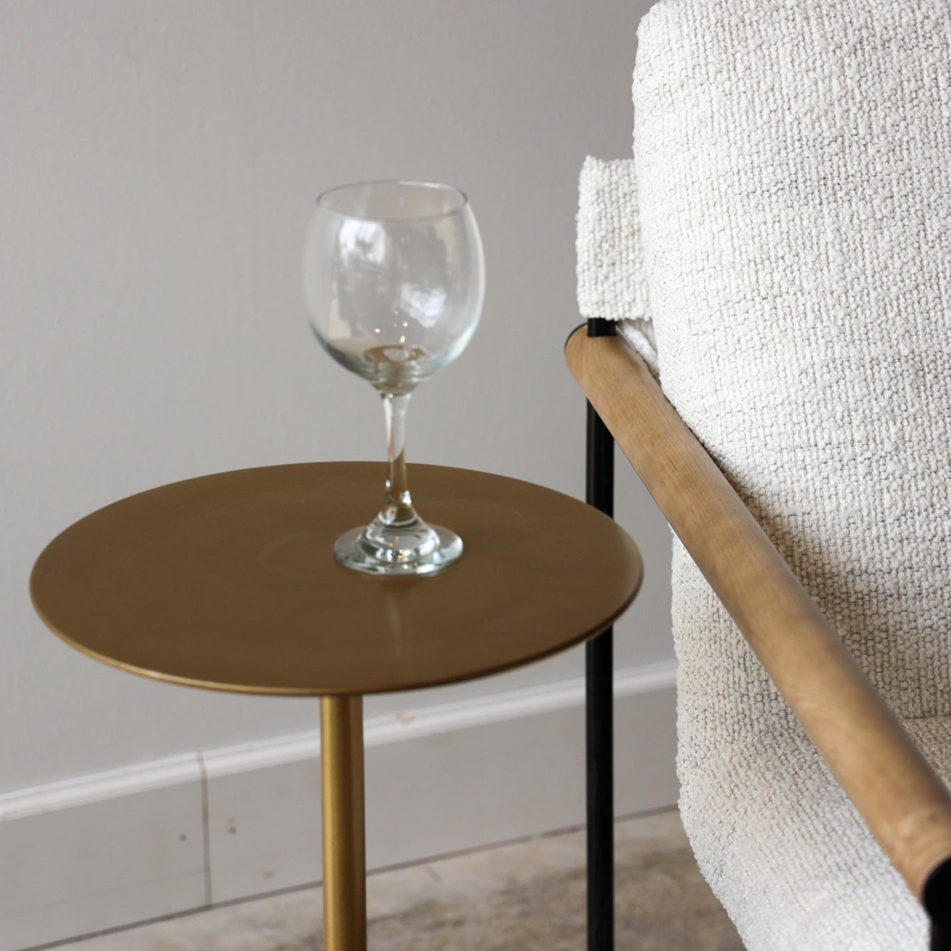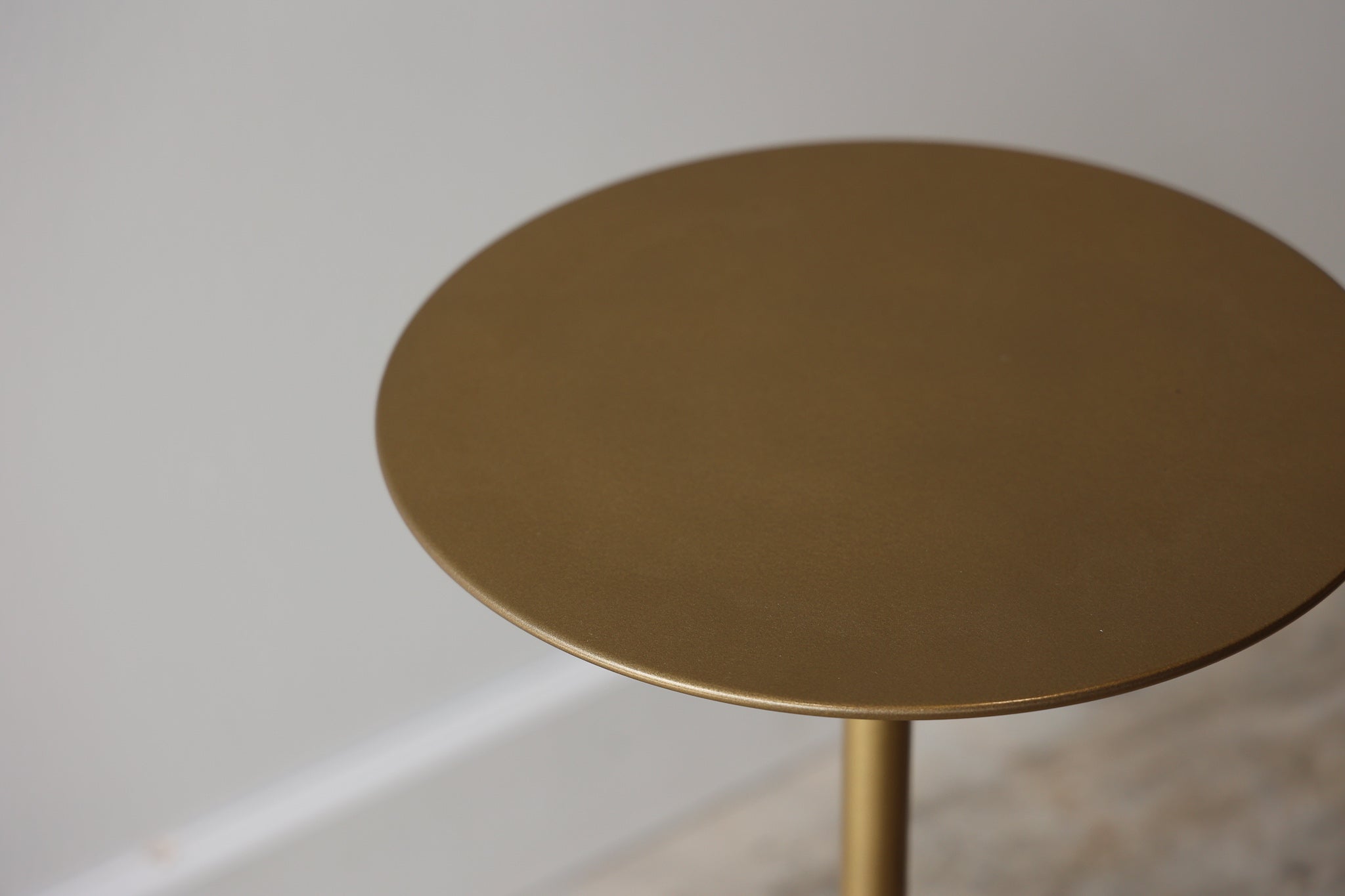 This sleek drink table is the perfect way to add style and function to your space. It features a polished marble base and a shining brass top, combining classic elements for a timeless style. Its classic design makes it the perfect accent piece for any living room.