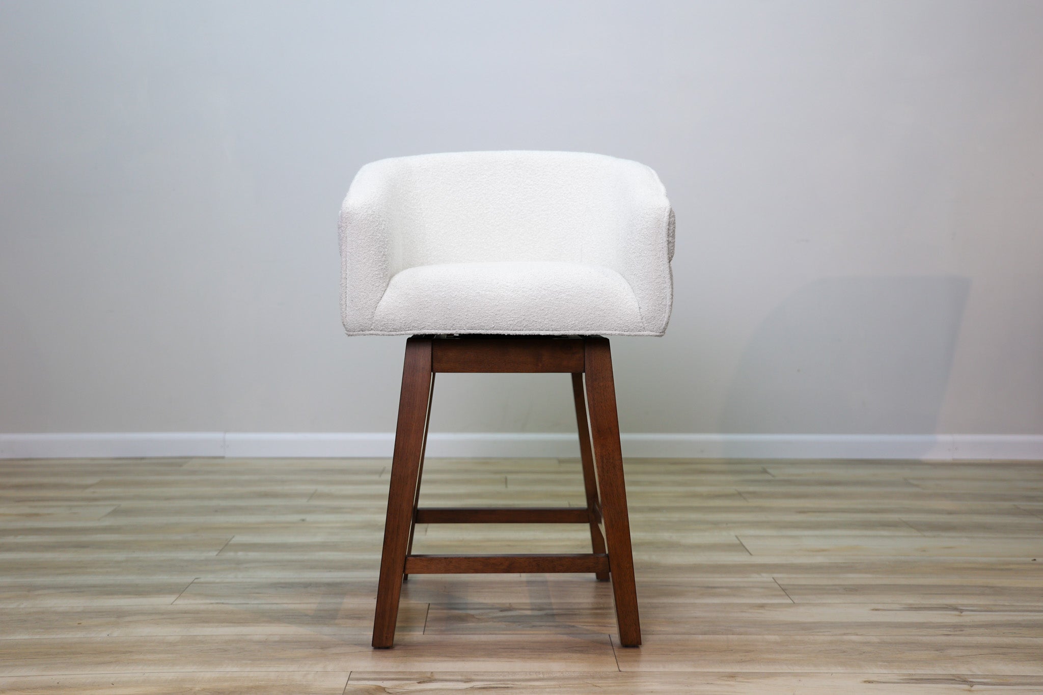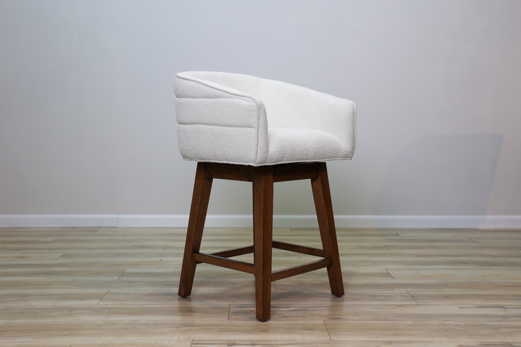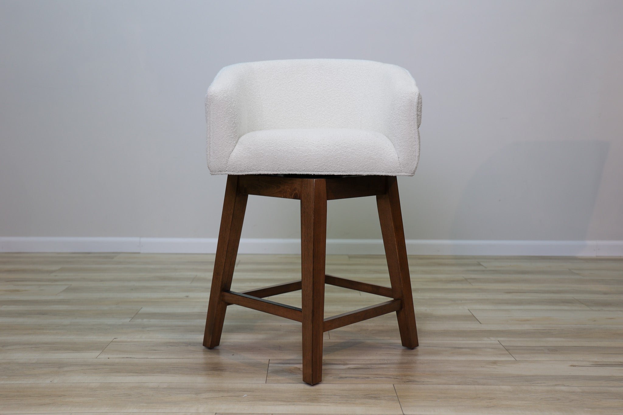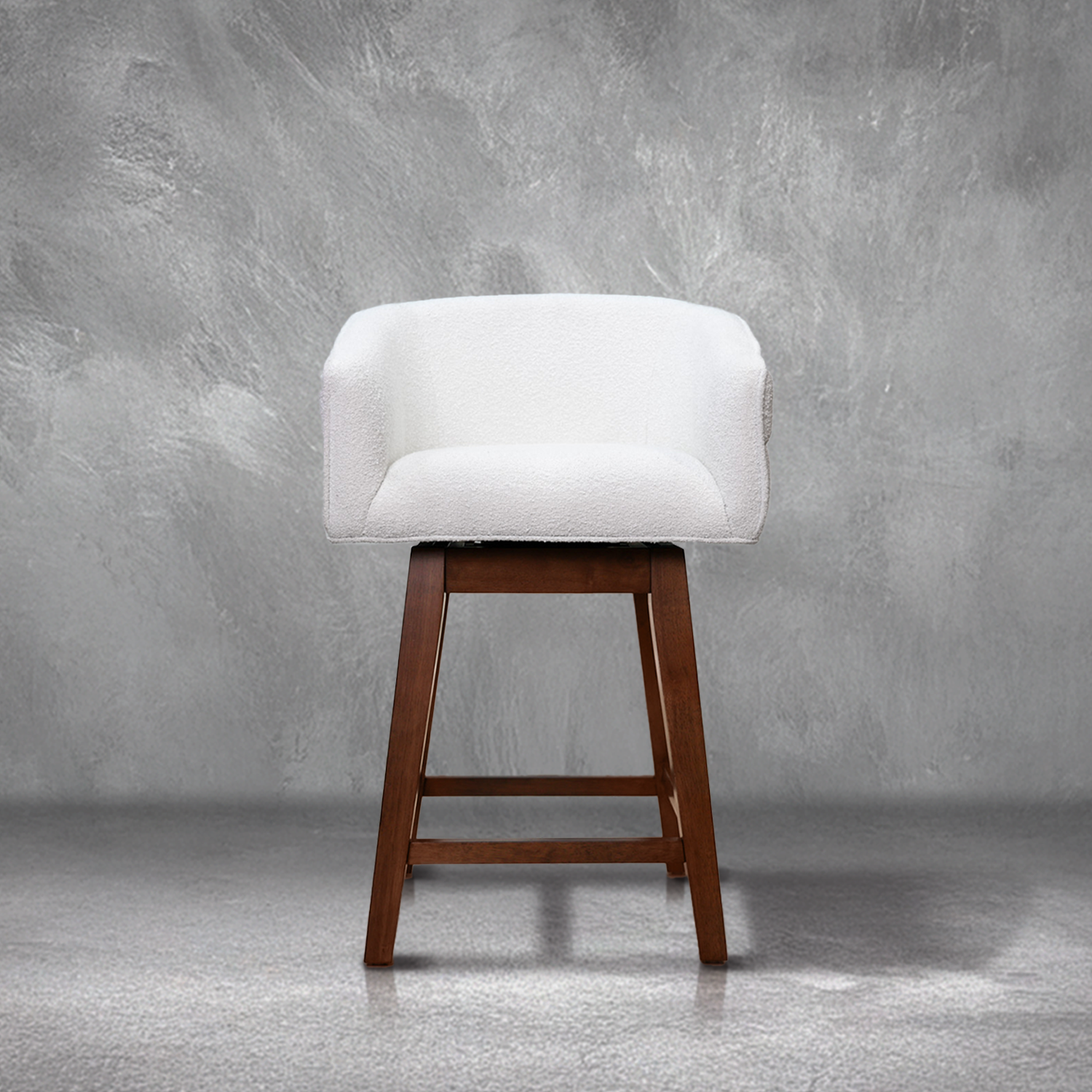 Meet the most versatile collection of stools Dwell has ever carried. Each stool has the option to come in both counter and bar height, can be locked or allowed to swivel, and comes in six seating styles, three fabric options and three leg base colors! Mix and match any of these options to your taste! Pictured we have the Barrel seat style with the Salt colored fabric and the Brown base legs at counter height!