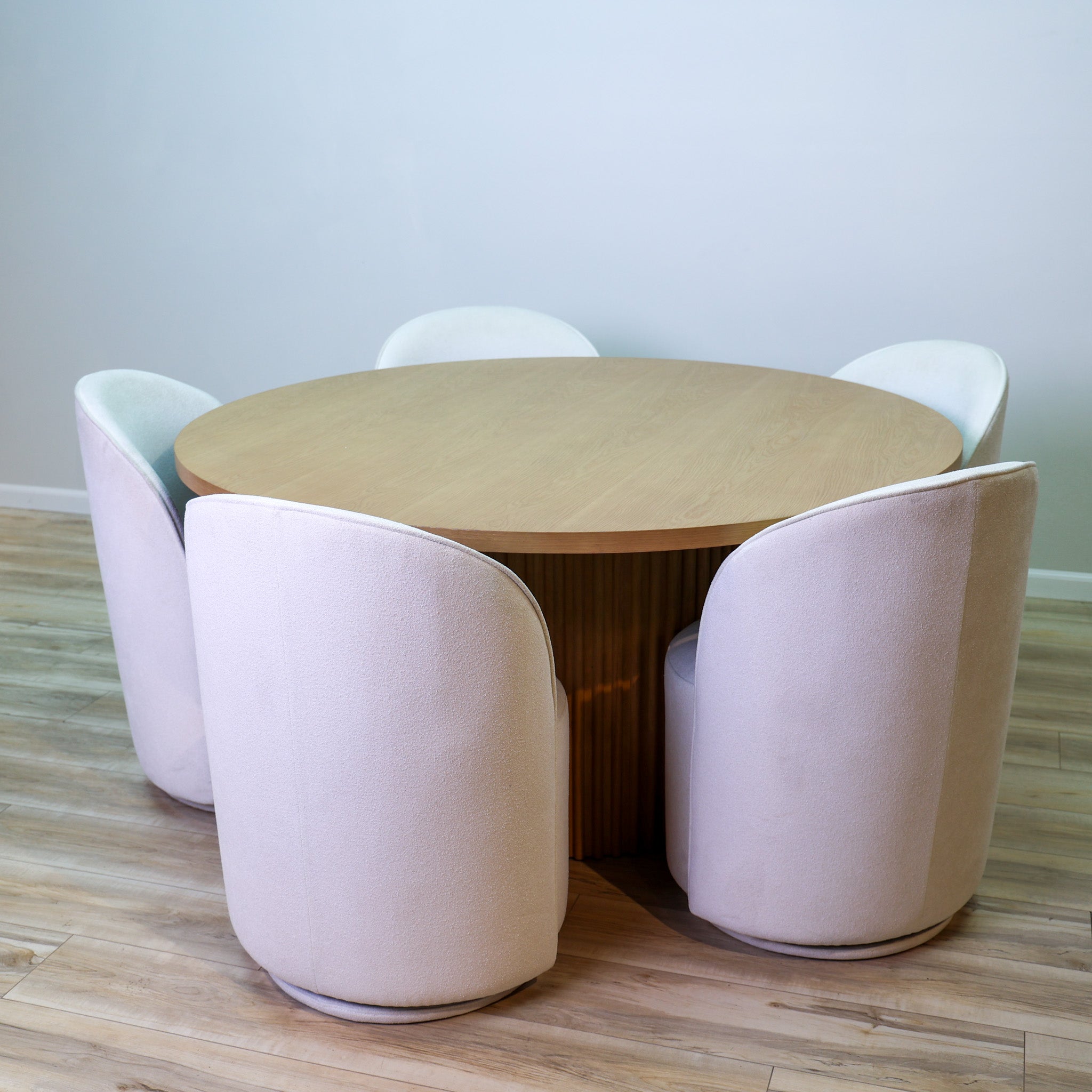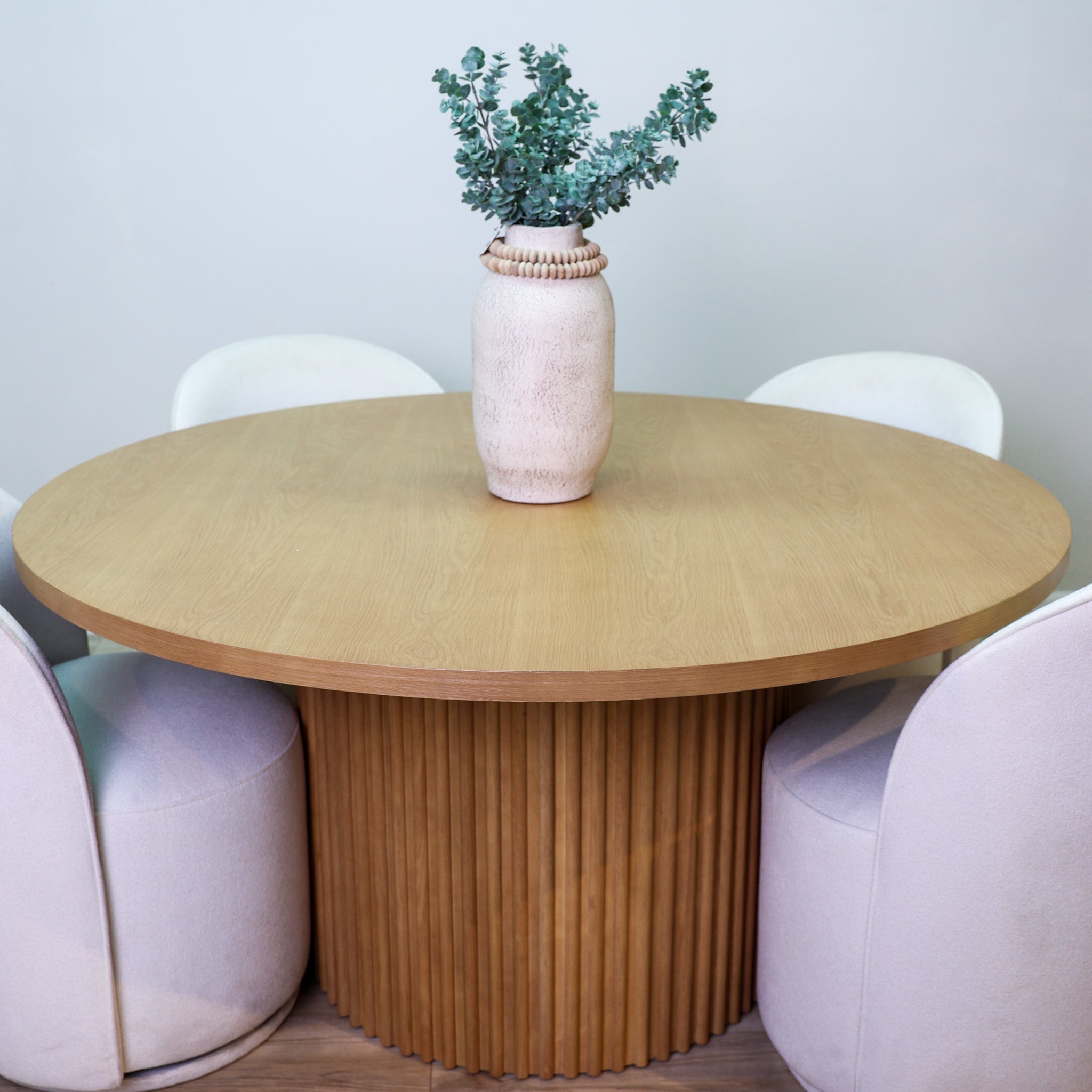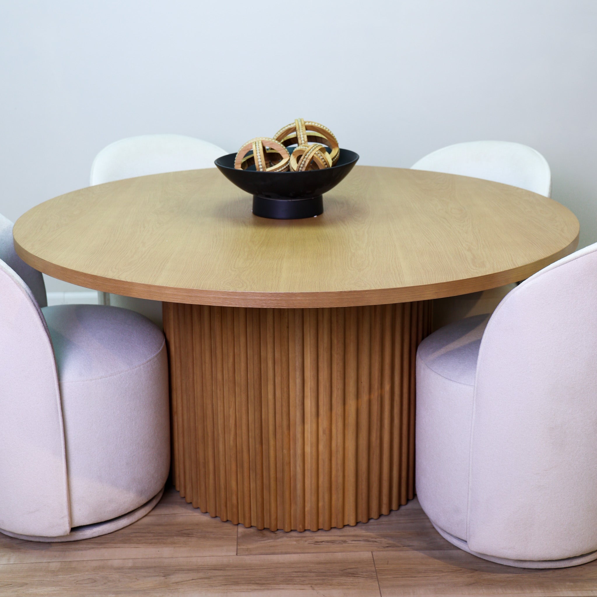 Expertly crafted, the Timmy Round Dining Table combines a sleek round shape with light tones wood for a modern touch. Its reeded pedestal base adds visual interest while providing sturdy support. Perfect for hosting guests or enjoying meals with family, this table elevates any dining experience. Available in 60 inch and 48 inch sizes