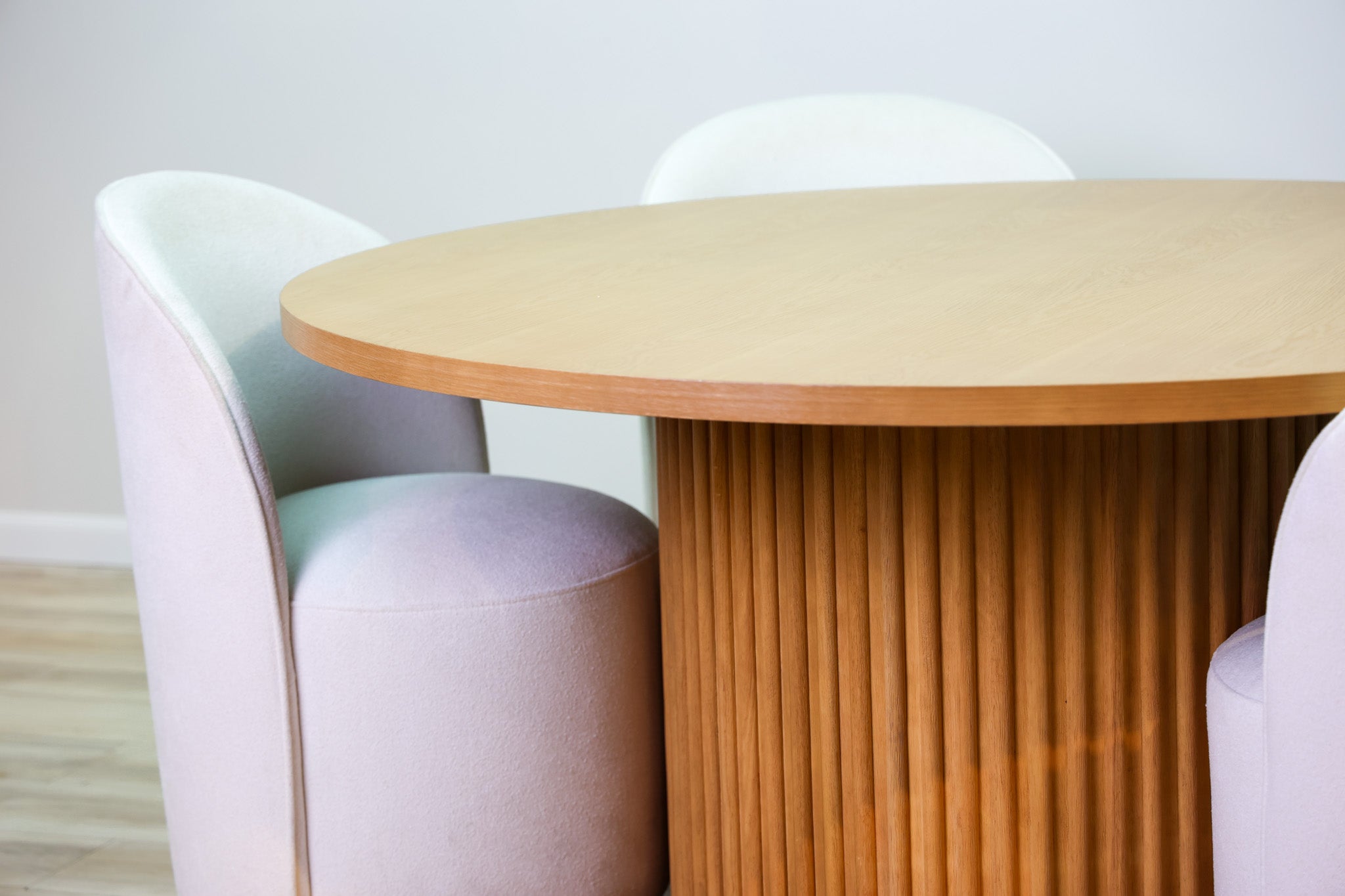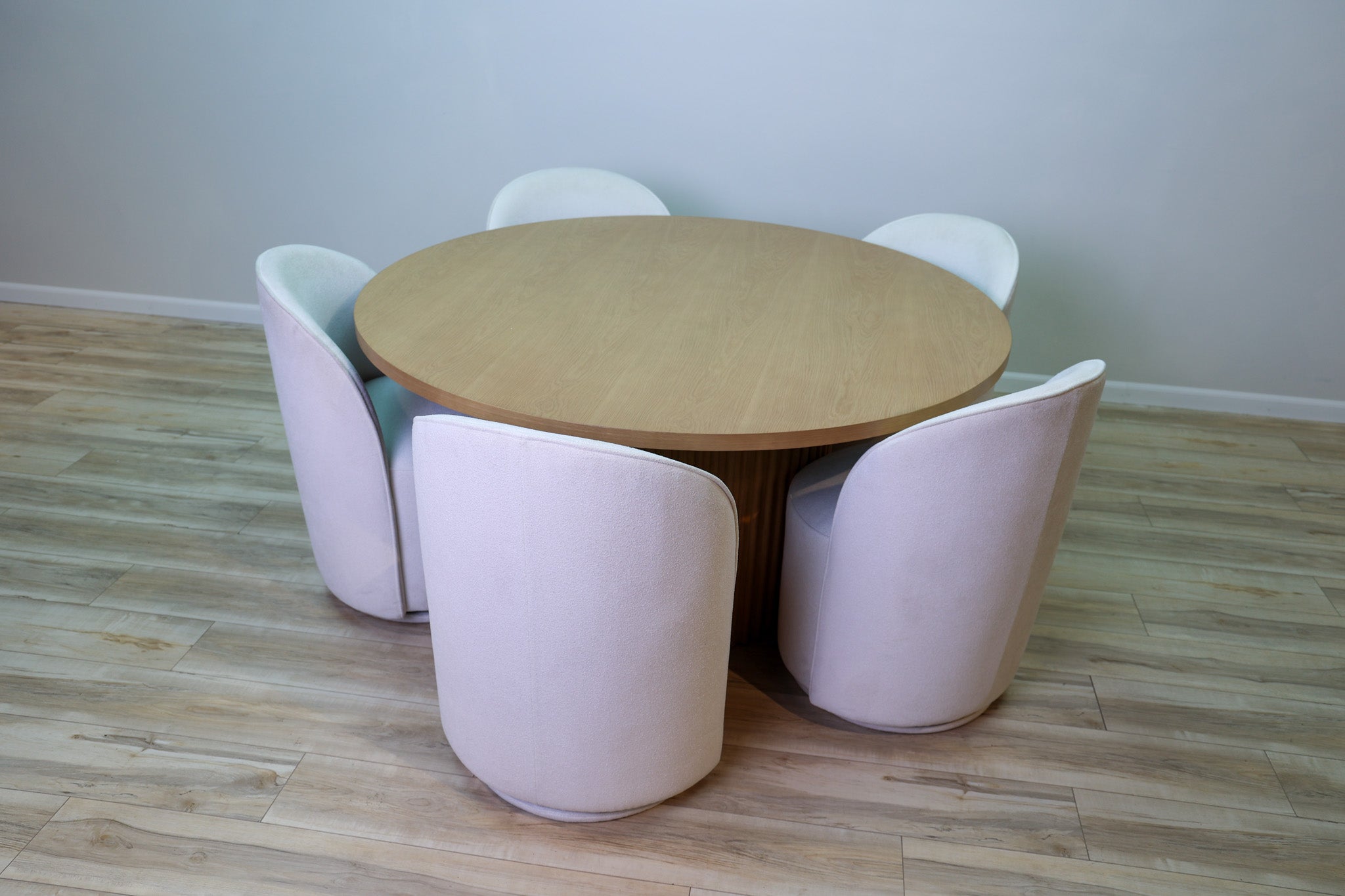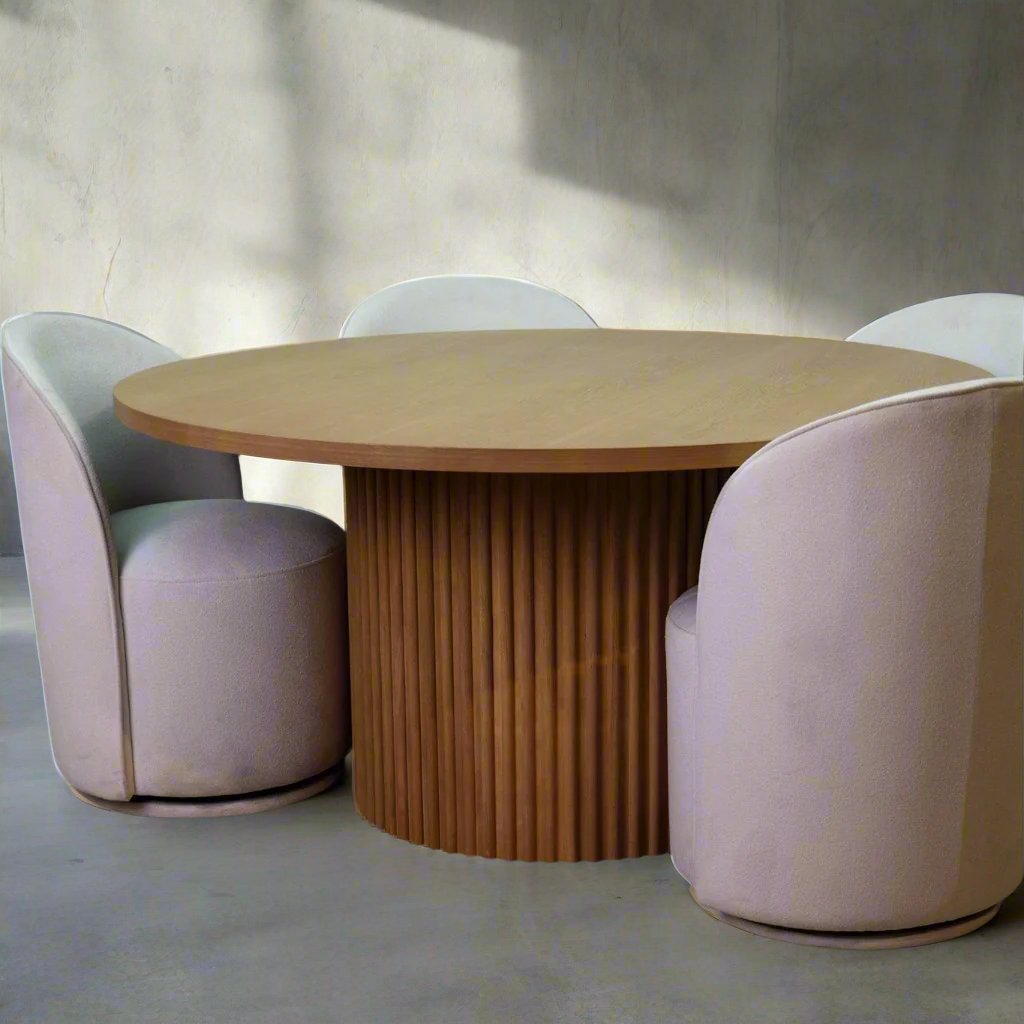 Expertly crafted, the Timmy Round Dining Table combines a sleek round shape with light tones wood for a modern touch. Its reeded pedestal base adds visual interest while providing sturdy support. Perfect for hosting guests or enjoying meals with family, this table elevates any dining experience. Available in 60 inch and 48 inch sizes