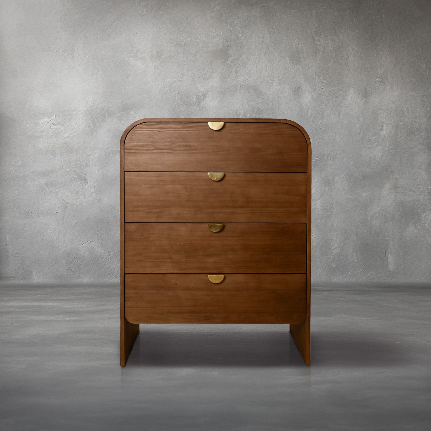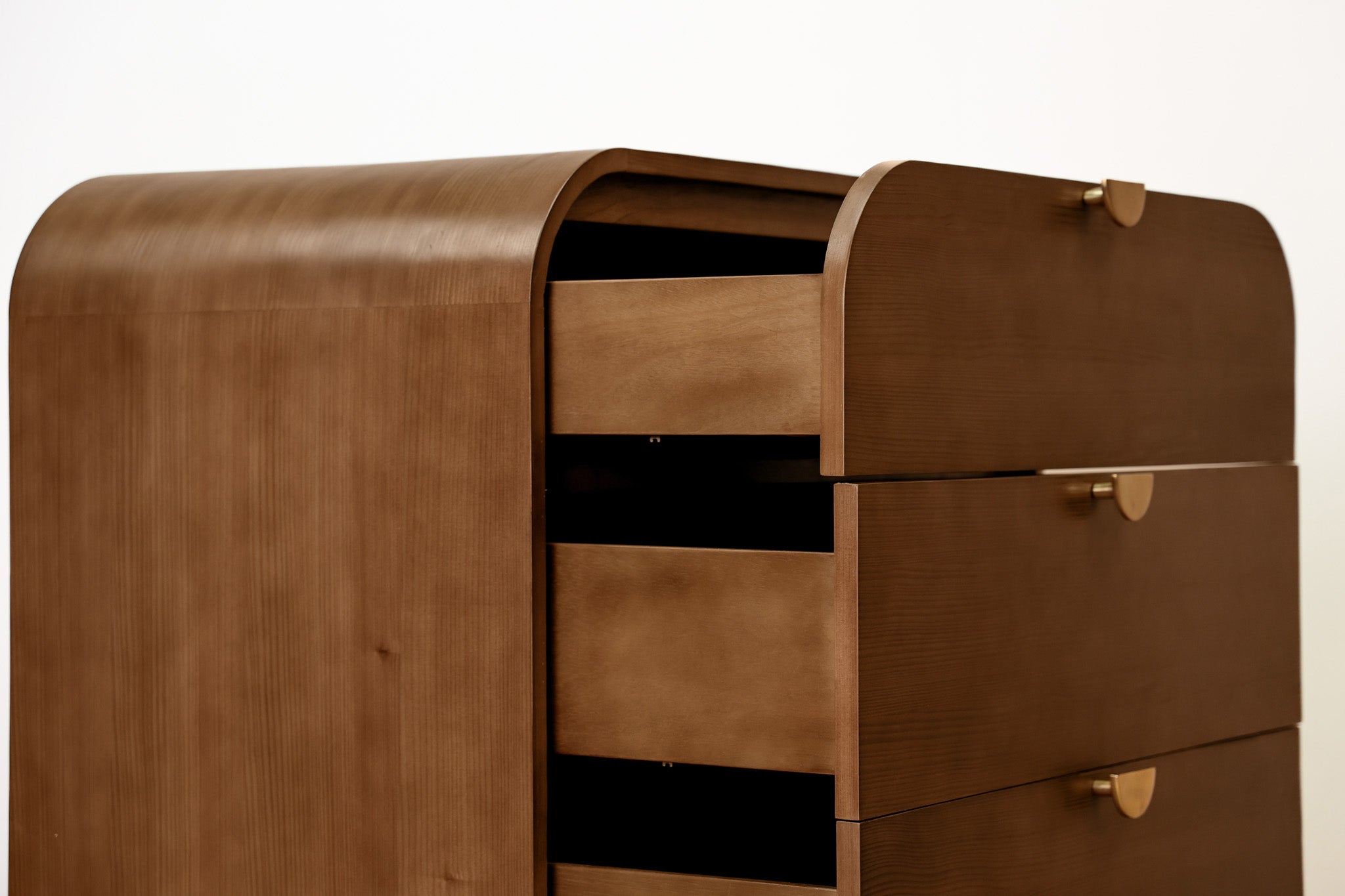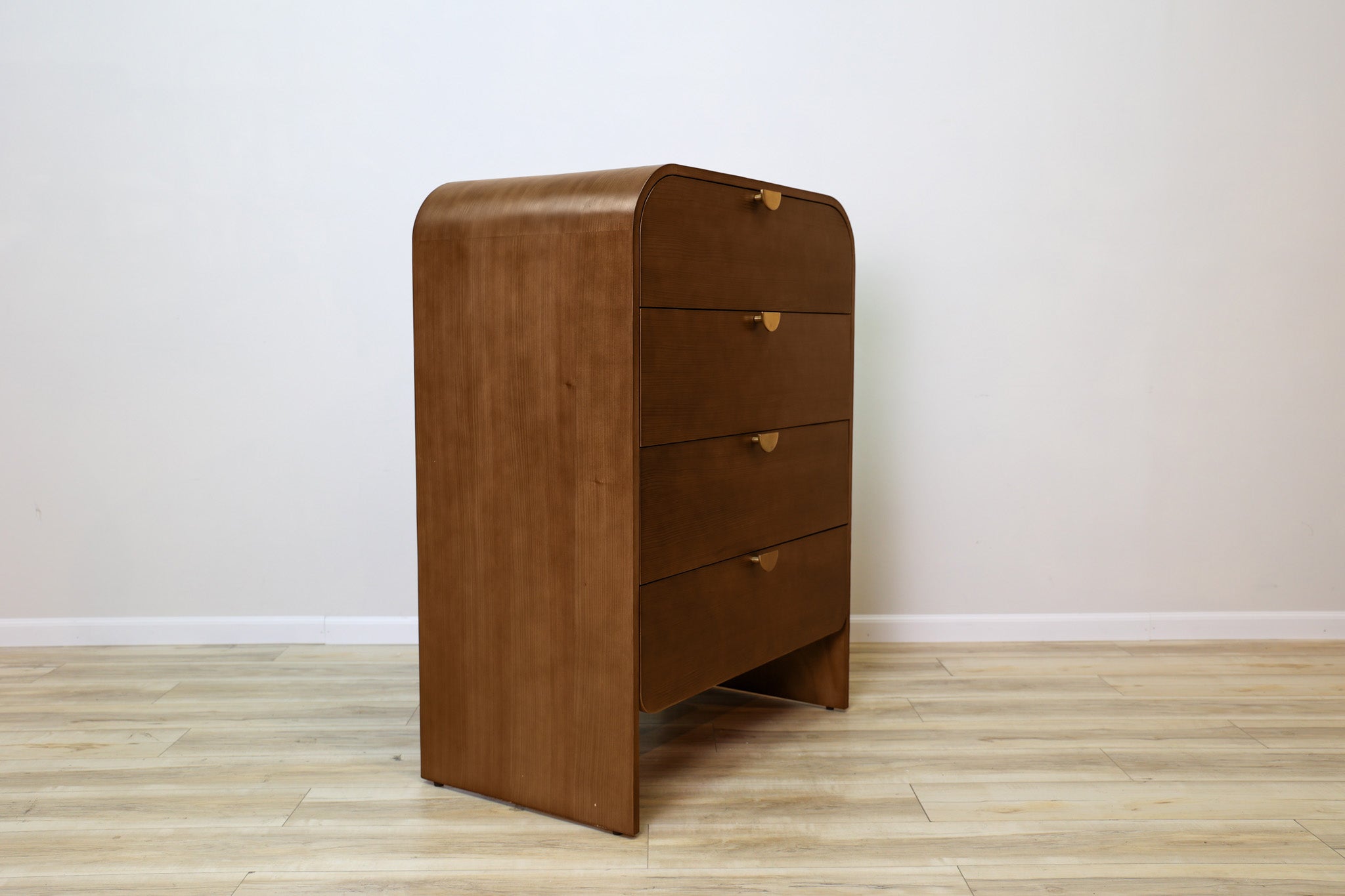 Bring in the vintage vibes with a modern twist! The Virgo chest is a Dwell original design crafted of mango wood with a wood veneer. Its rich warm finish with antique gold handles give that vintage touch, while its rounded edges and soft shapes bring in the post modern design elements. Have it on its own of with the matching Virgo nightstand to bring the whole bedroom together!