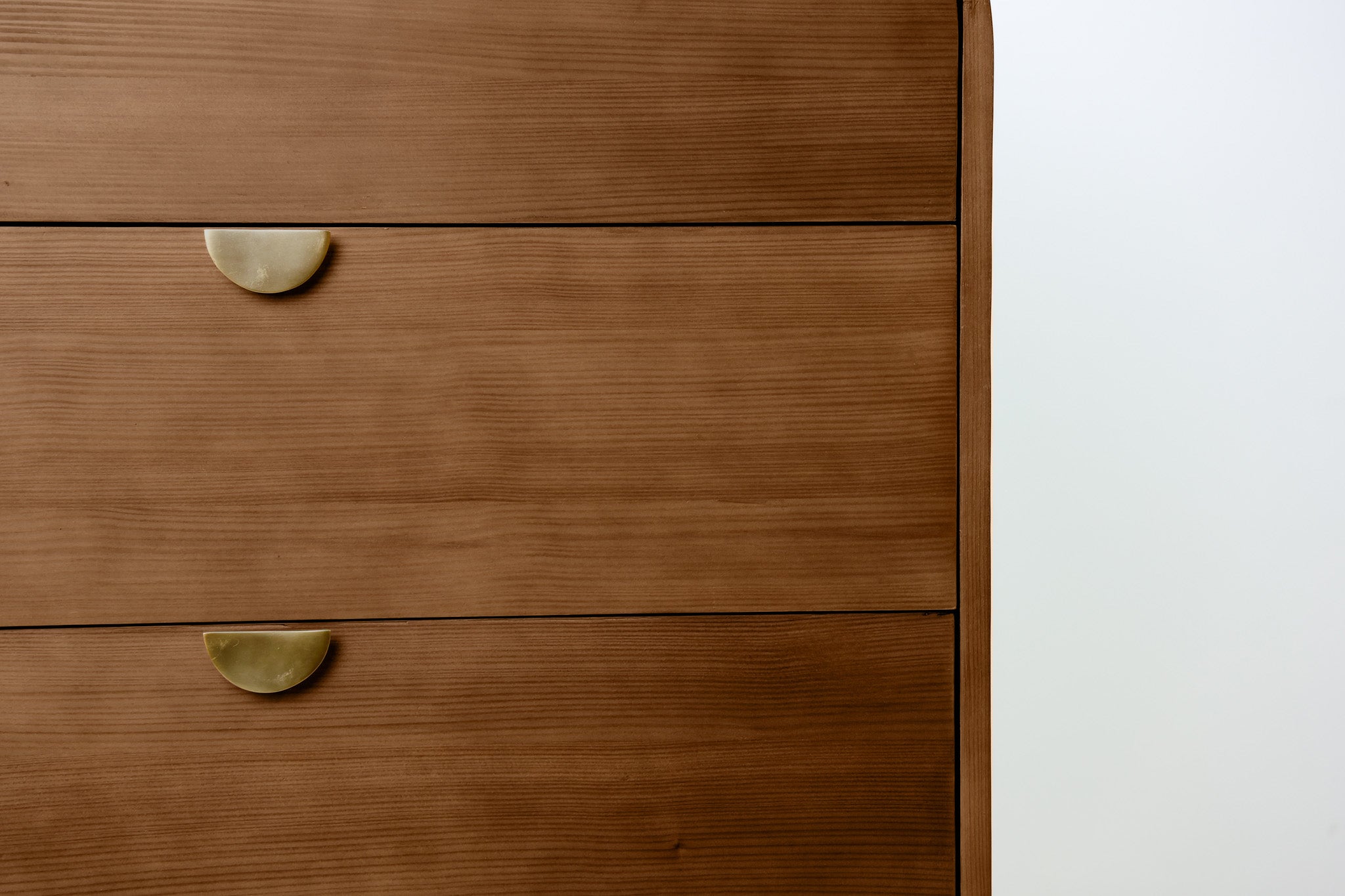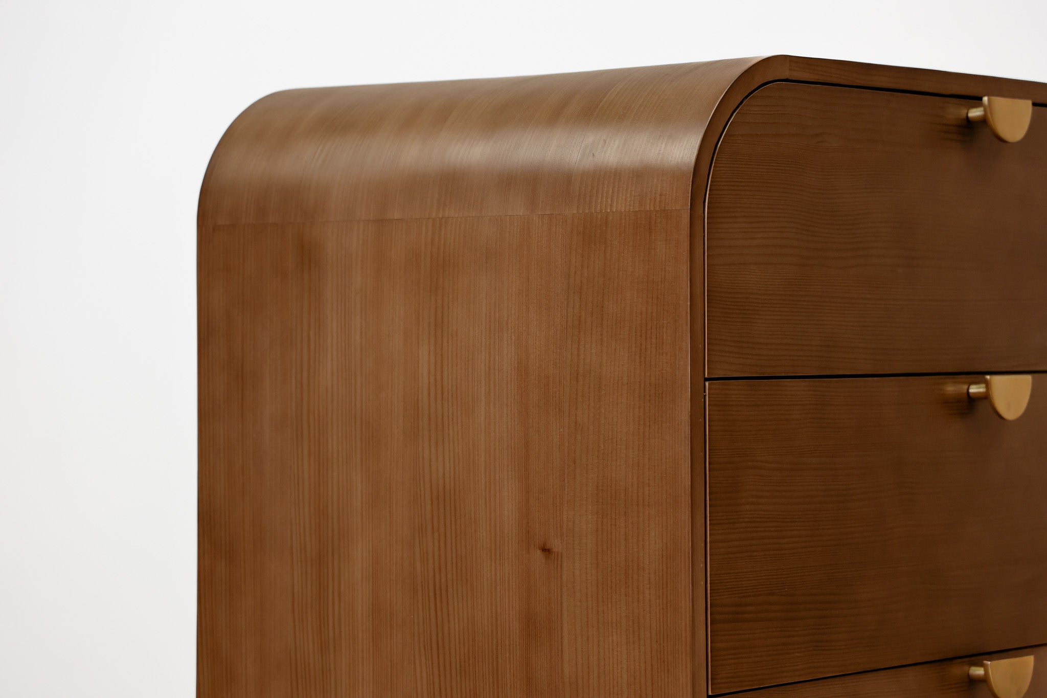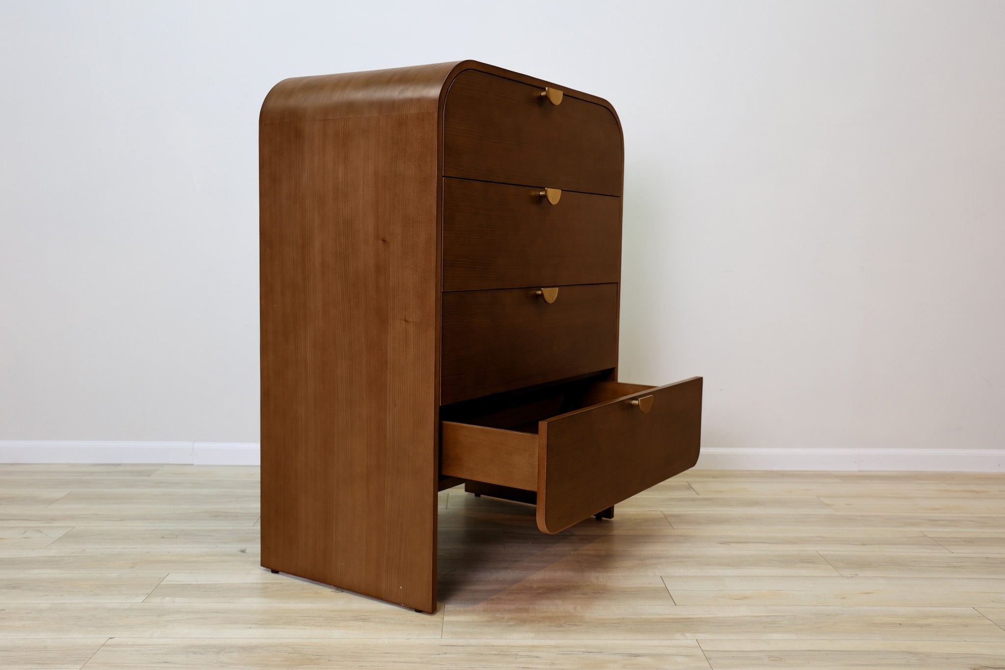 Bring in the vintage vibes with a modern twist! The Virgo chest is a Dwell original design crafted of mango wood with a wood veneer. Its rich warm finish with antique gold handles give that vintage touch, while its rounded edges and soft shapes bring in the post modern design elements. Have it on its own of with the matching Virgo nightstand to bring the whole bedroom together!