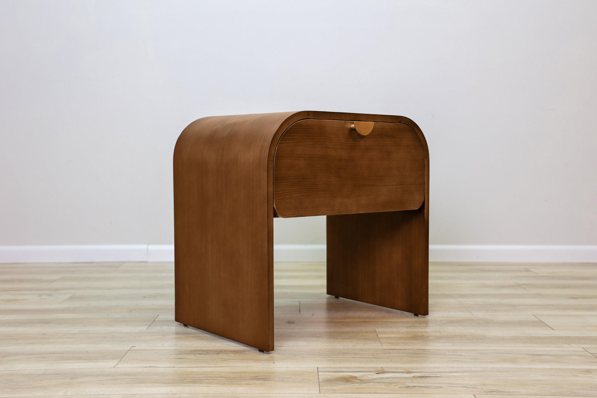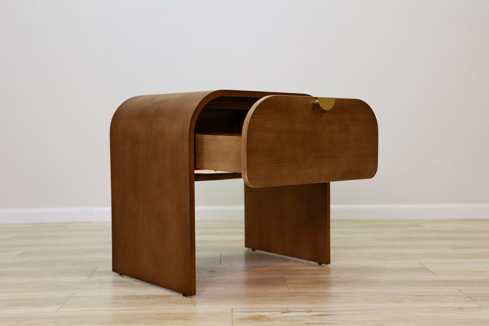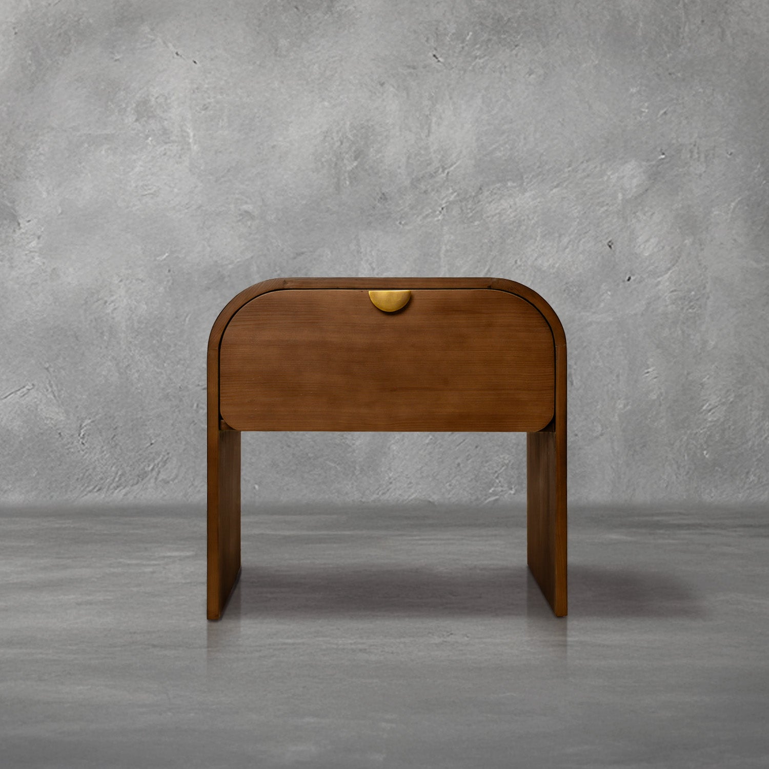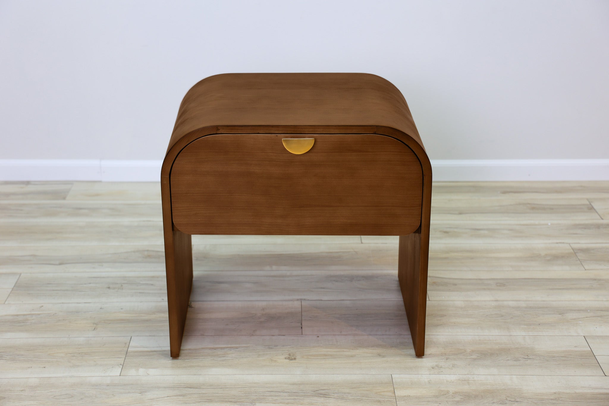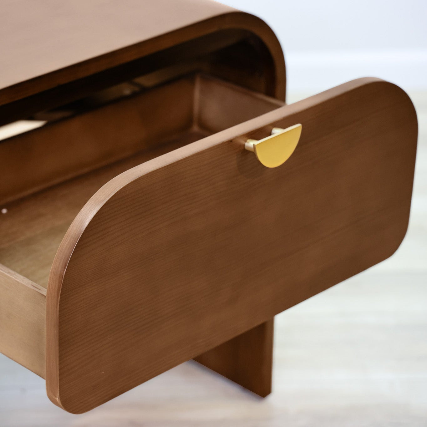 The compliment to our Virgo Chest, this lovely piece ties together the best of vintage and modern. Its warm rich brown finish with antique gold handles pair nicely with the soft shapes of postmodern design - giving vintage, but not outdated! Comes with a storage drawer for all those valuables you need on hand and soft close drawers. Made of mango wood with a wood veneer finish. Complete your bedroom today with the Virgo Nightstand!
